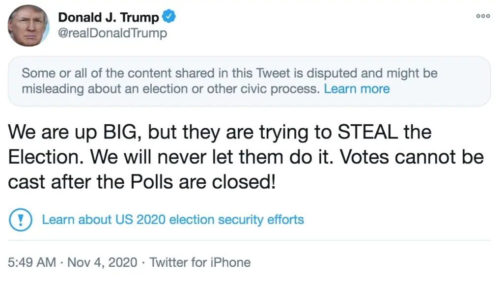 Trump tweeted: "We are up BIG, but they are trying to STEAL the Election. We will never let them do it. Votes cannot be cast after the Polls are closed!"
