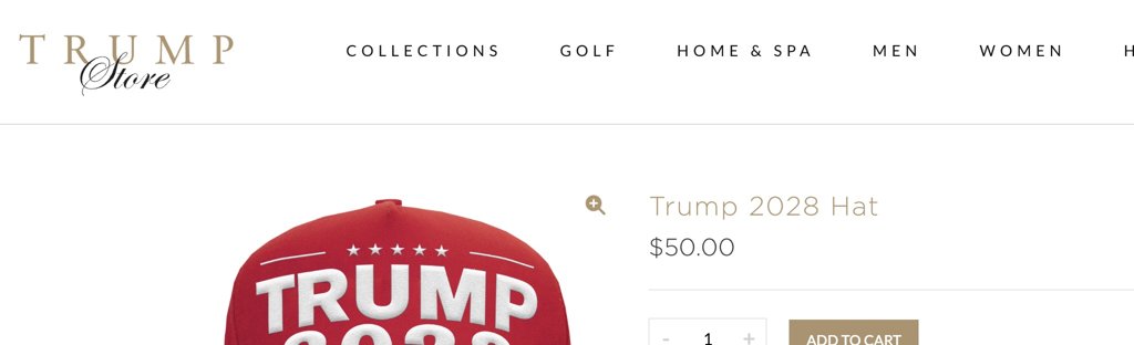 “The future looks bright! Rewrite the rules with the Trump 2028 high crown hat,” reads the product description. “Fully embroidered with a snap closure in the back, this will become your new go-to hat.”