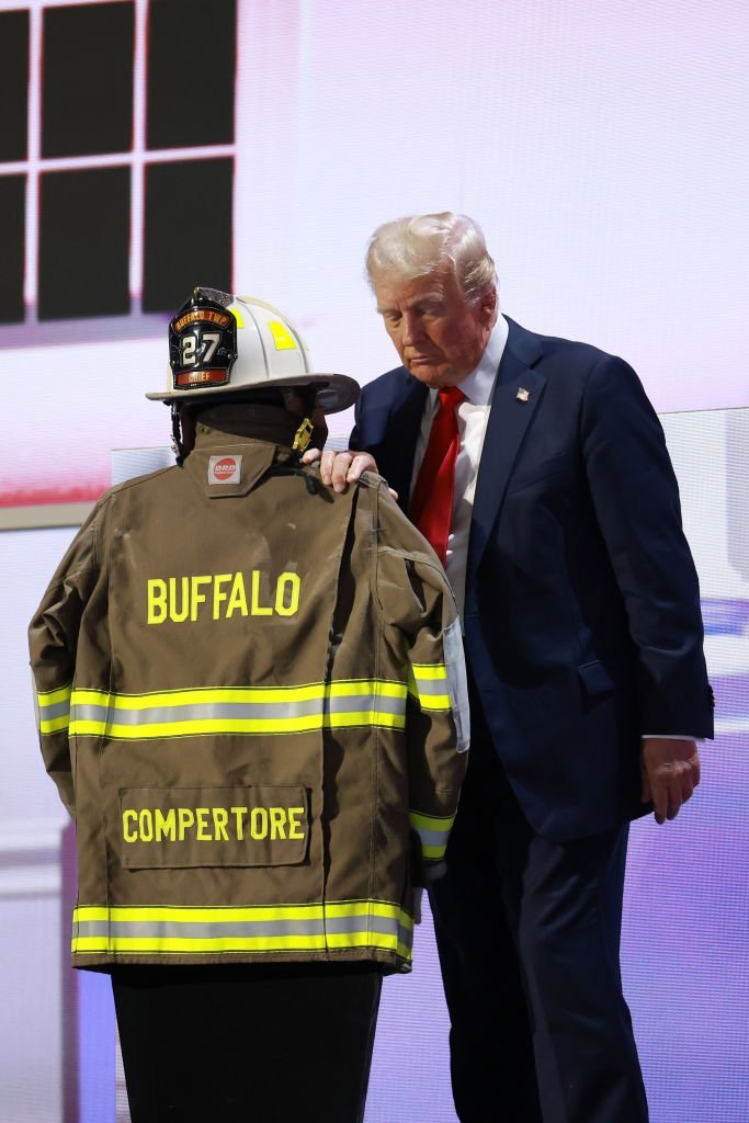 In the lengthy speech, he also took the time to honor the victim of the shooting, Corey Comperatore, a 50-year-old firefighter from Sarver, by bringing his uniform to the stage and kissing the helmet lightly.