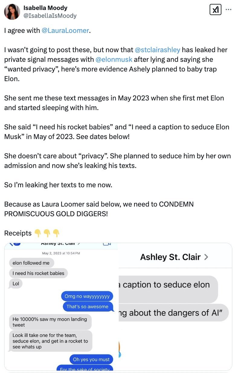 According to screenshots Moody posted, St. Clair allegedly texted her in May 2023, saying: "Elon followed me."