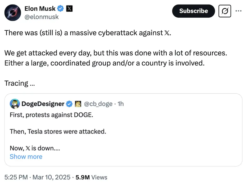 “There was (still is) a massive cyberattack against X,” Musk posted on the platform. “We get attacked every day, but this was done with a lot of resources.