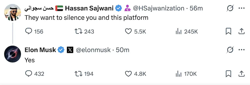 Musk later shared a tweet agreeing with a user who claimed that somebody is attempting to "silence" him and the platform.