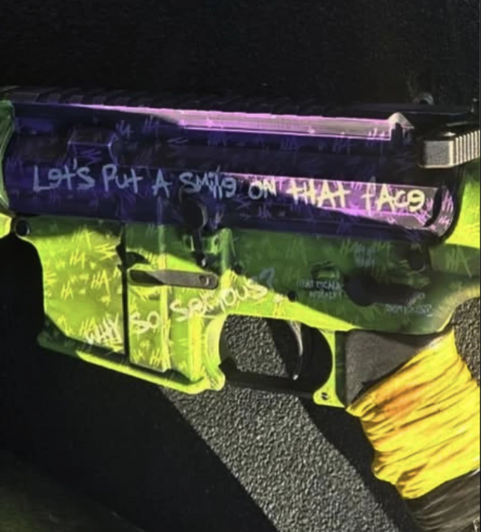 The loaded rifle he was found with was painted purple and green and had phrases uttered by the psychotic supervillain, the Joker, written all over it.