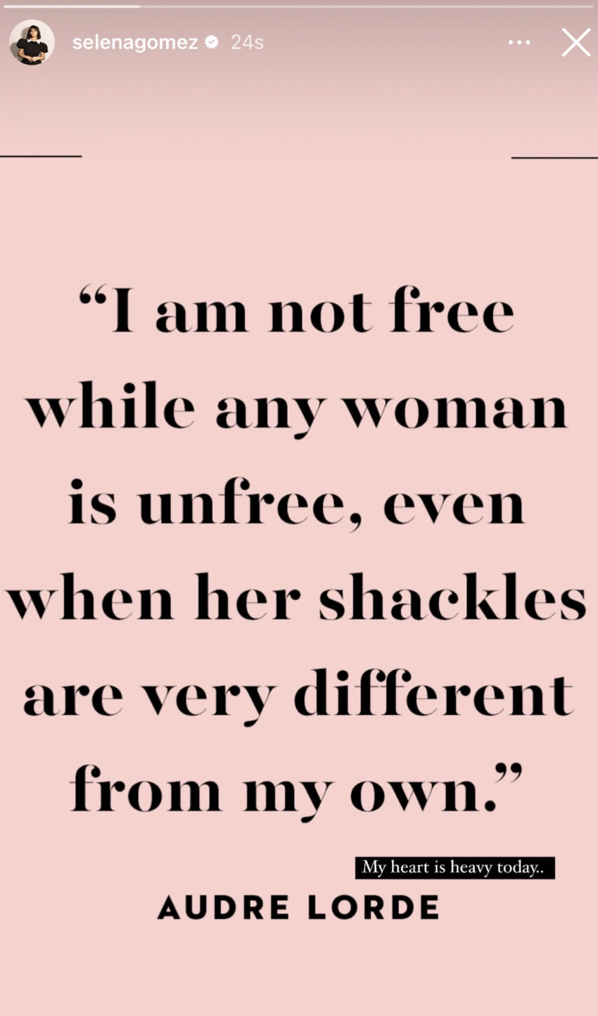 Selena Gomez also joined the chorus of voices reacting to Trump’s victory, opting for a cryptic yet powerful quote on her Instagram Stories penned by feminist Audre Lorde: "I am not free while any woman is unfree, even when her shackles are very different from my own."