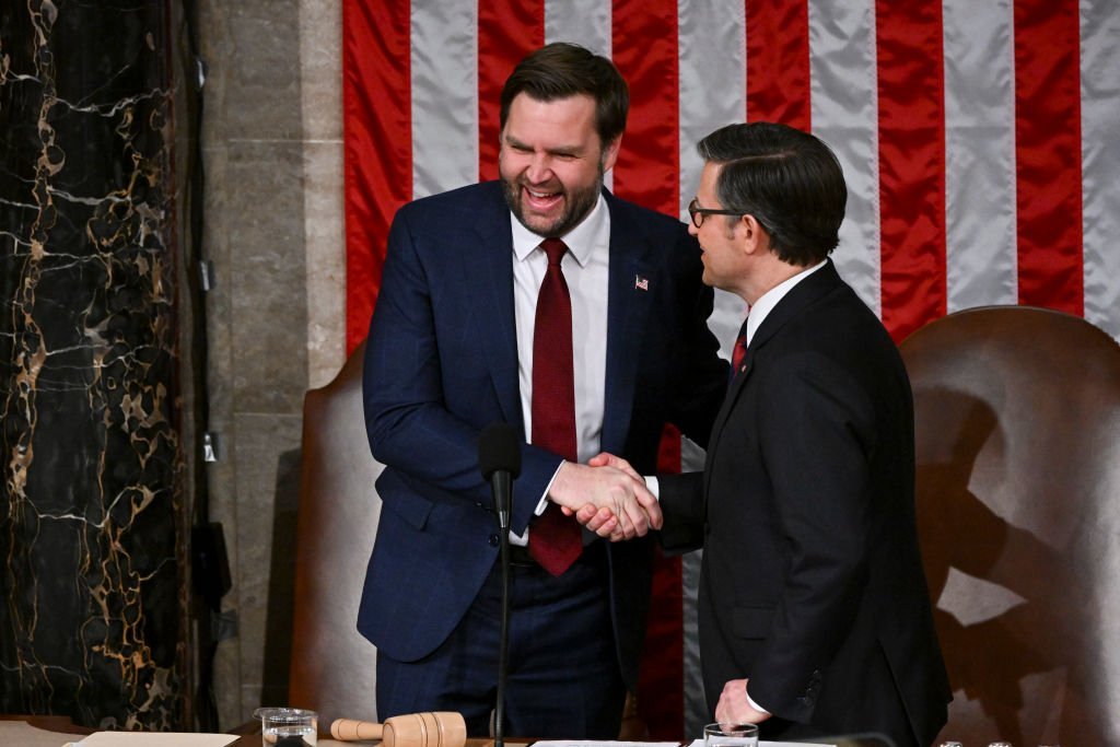 Vice President JD Vance and Speaker of the House Mike Johnson shared a lighthearted moment, complete with a whispered remark and a swipe at President Joe Biden’s past speeches.