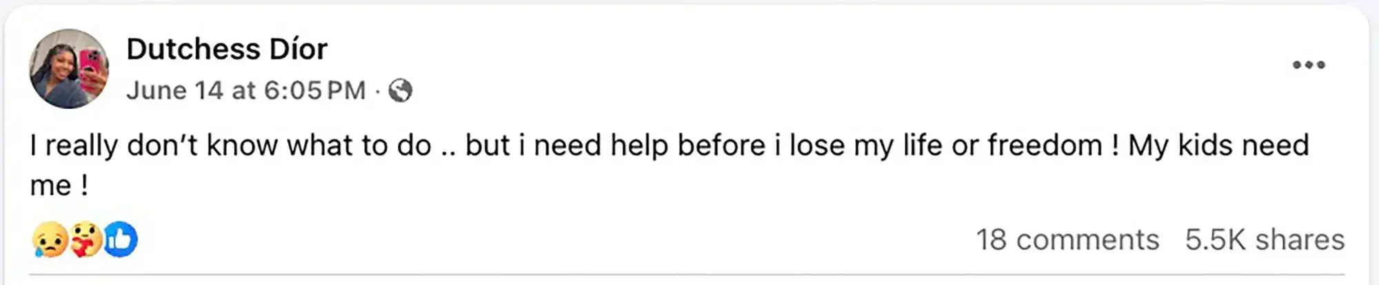 Just over three hours earlier, Carr had posted a desperate message to her 35,000 followers on her Facebook page: “I really don’t know what to do,” she wrote at 6PM, “..but I need help before I lose my life or freedom! My kids need me!”