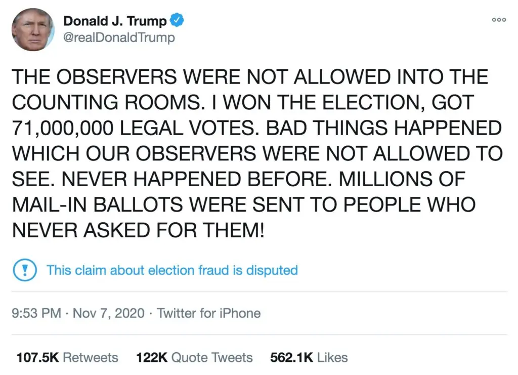 "THE OBSERVERS WERE NOT ALLOWED INTO THE COUNTING ROOMS. I WON THE ELECTION, GOT 71,000,000 LEGAL VOTES. BAD THINGS HAPPENED WHICH OUR OBSERVERS WERE NOT ALLOWED TO SEE. NEVER HAPPENED BEFORE. MILLIONS OF MAIL-IN BALLOTS WERE SENT TO PEOPLE WHO NEVER ASKED FOR THEM!"