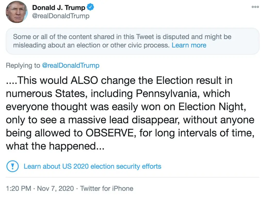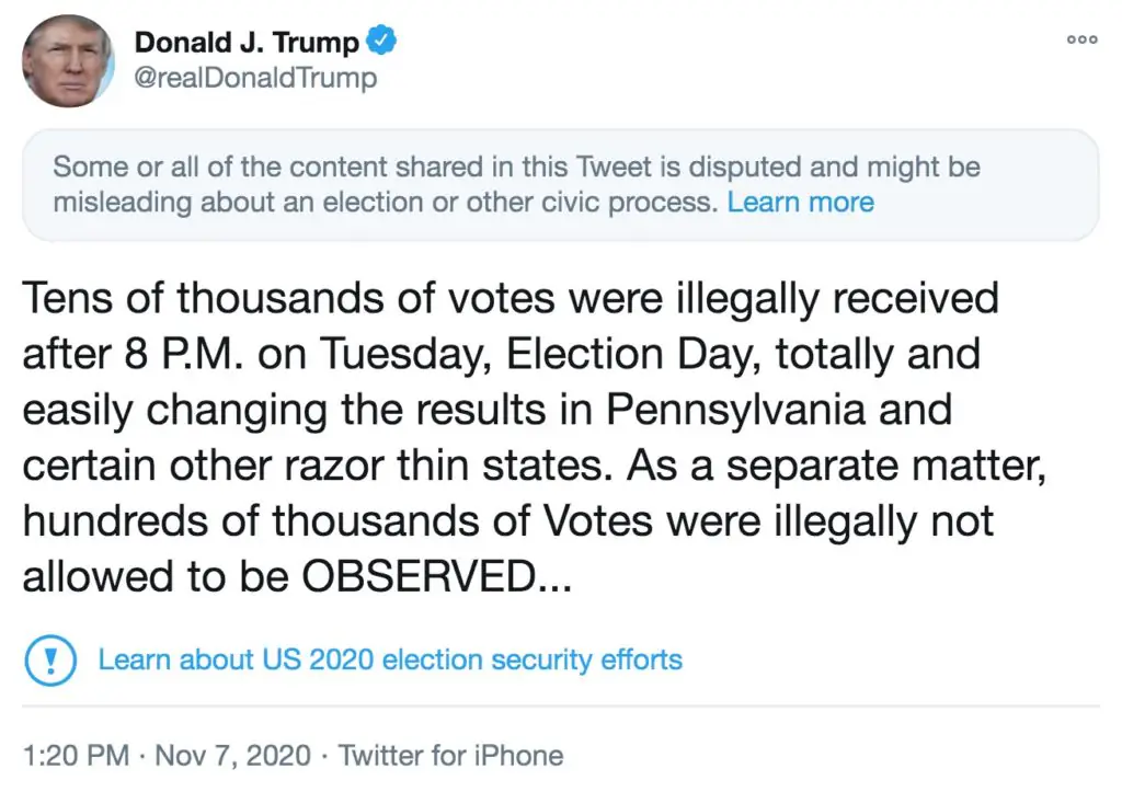 "Tens of thousands of votes were illegally received after 8 P.M. on Tuesday, Election Day, totally and easily changing the results in Pennsylvania and certain other razor thin states. As a separate matter, hundreds of thousands of Votes were illegally not allowed to be OBSERVED...