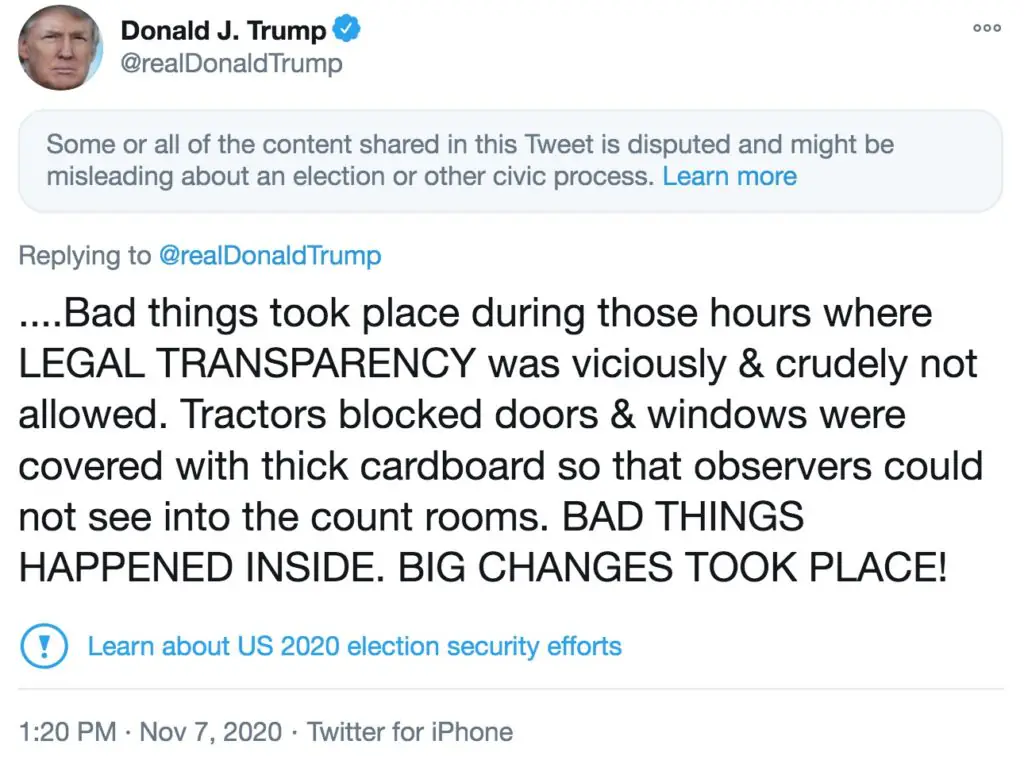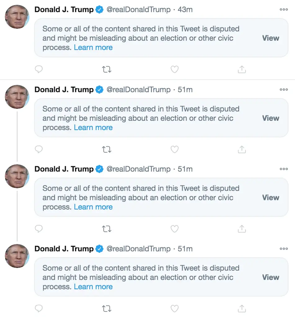 On each of the tweets, Twitter has included the following message: "Some or all of the content shared in this Tweet is disputed and might be misleading about an election or other civic process."