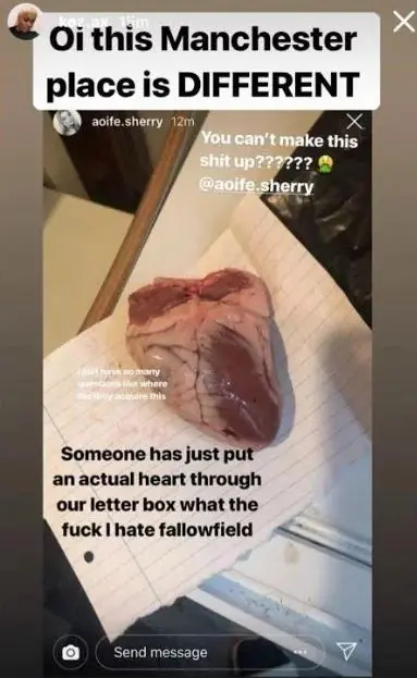"Someone has posted an actual heart through our letterbox what the f**k I hate Fallowfield," Aoife wrote on her Instagram story. Eventually they realised that it was the heart of a lamb (likely bought from the butchers), and not a threat as she feared, but it didn't exactly make make the situation any less grotesque.