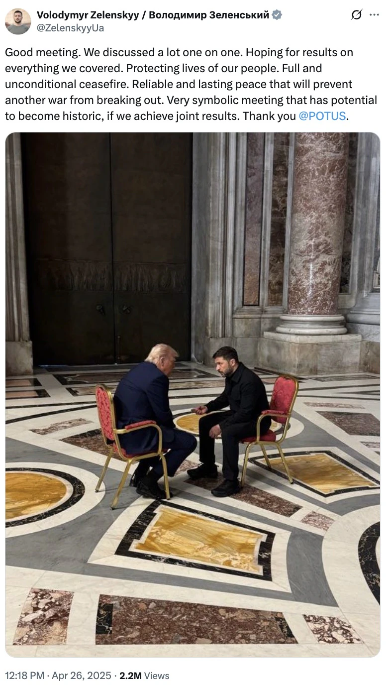Additionally, before the funeral of Pope Francis in Vatican City on April 26, Trump and Zelenskyy held a private meeting — their first in-person encounter since their tense White House exchange earlier this year.
