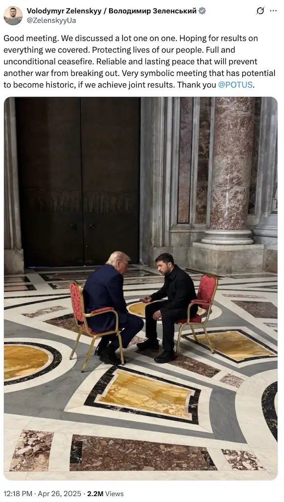 Trump and Zelensky's meeting marked their first encounter since an Oval Office clash nearly two months ago. The White House described the meeting as “very productive,” while Zelensky echoed the sentiment on X, calling it a “good meeting".