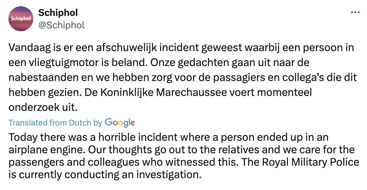 Additionally, officials from KLM Royal Dutch Airlines - the airline that operates the plane involved - also shared a statement on the tragedy, writing: “A fatal incident took place at Schiphol today during which a person ended up in a running aircraft engine.