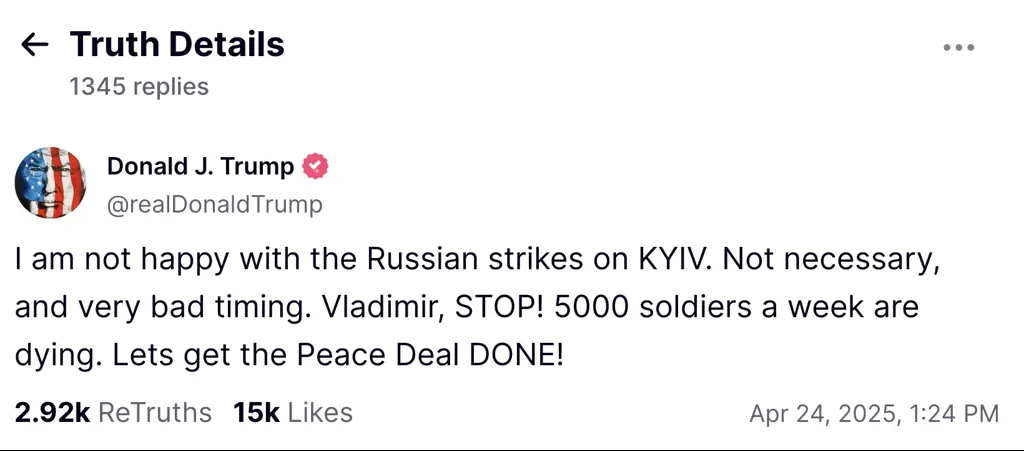 Taking to Truth Social, Trump called the bombing "Not necessary, and very bad timing," adding: “Vladimir, STOP! 5000 soldiers a week are dying. Lets get the Peace Deal DONE!”