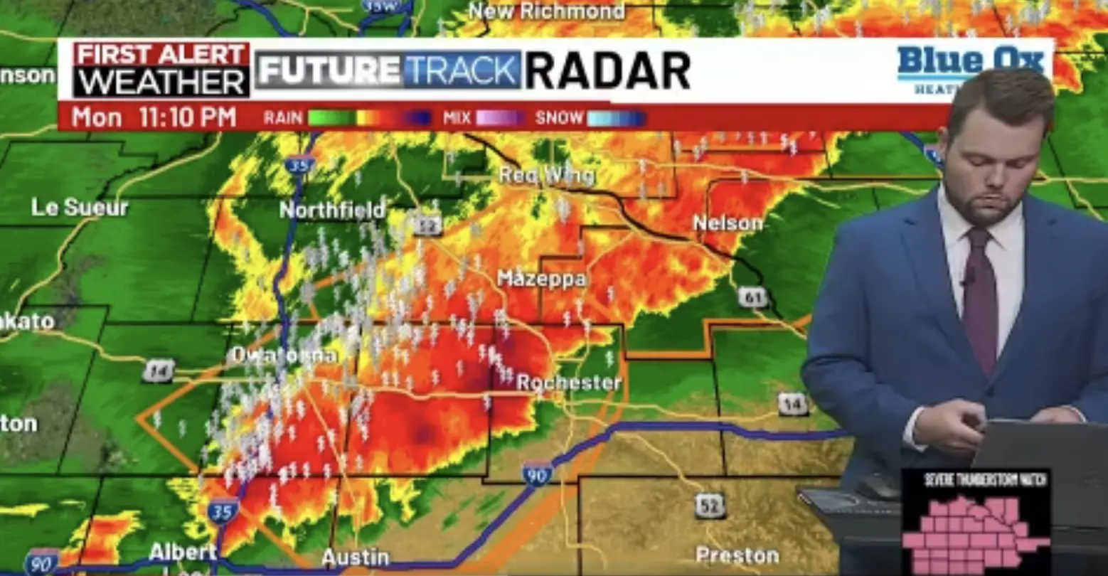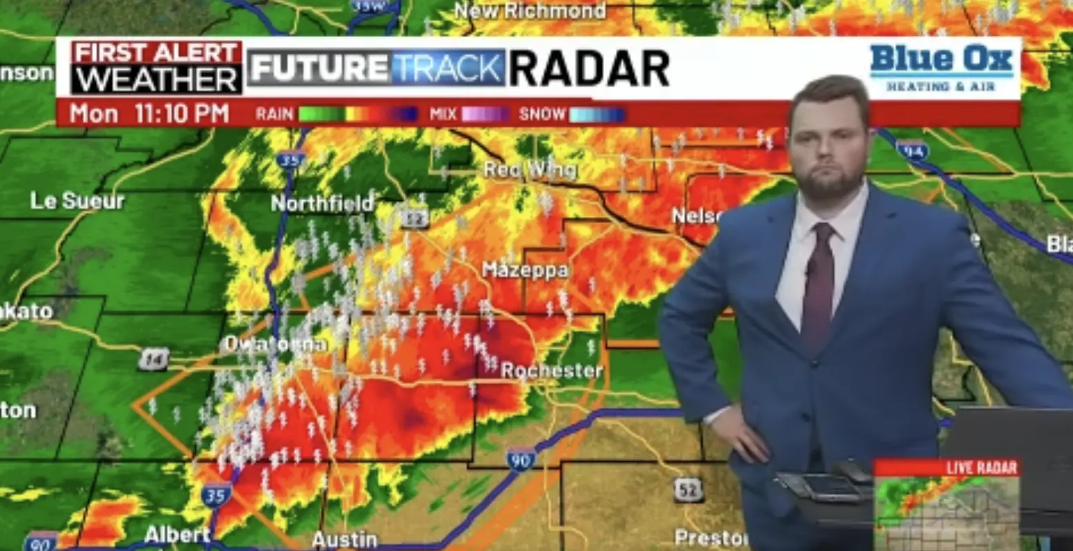 “Sorry, just had to text my wife,” Jansen said as he resumed the broadcast. “Baby was sleeping well tonight, so that’s gonna be over with at this point in time.” He then continued reporting on the strong winds in the Rochester area, estimating gusts between 40 and 70 mph.