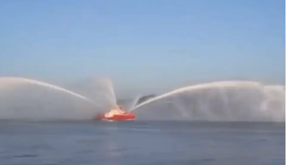 The now widely shared clip, viewed over 50 million times across X and YouTube, shows a tugboat escorting a towering cargo ship while shooting water high into the sky.